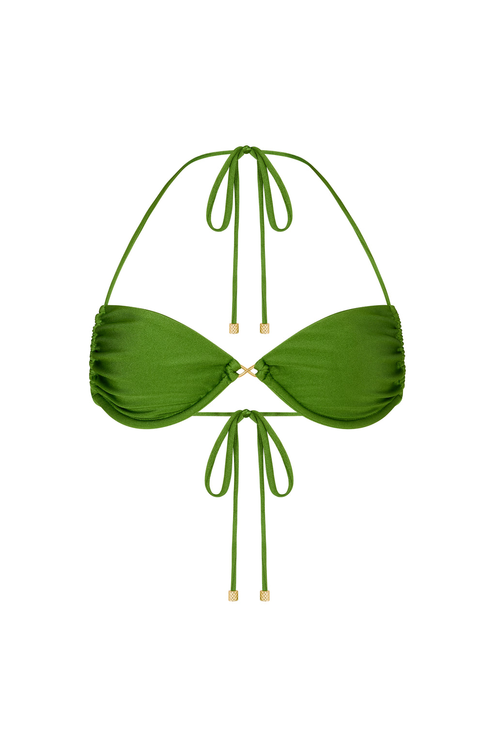The Aurelia in Cactus by Sommer Swim is a halter neck bikini top with visible tie features, delicate custom gold hardware Infinity embellishment and adjustability for coverage.