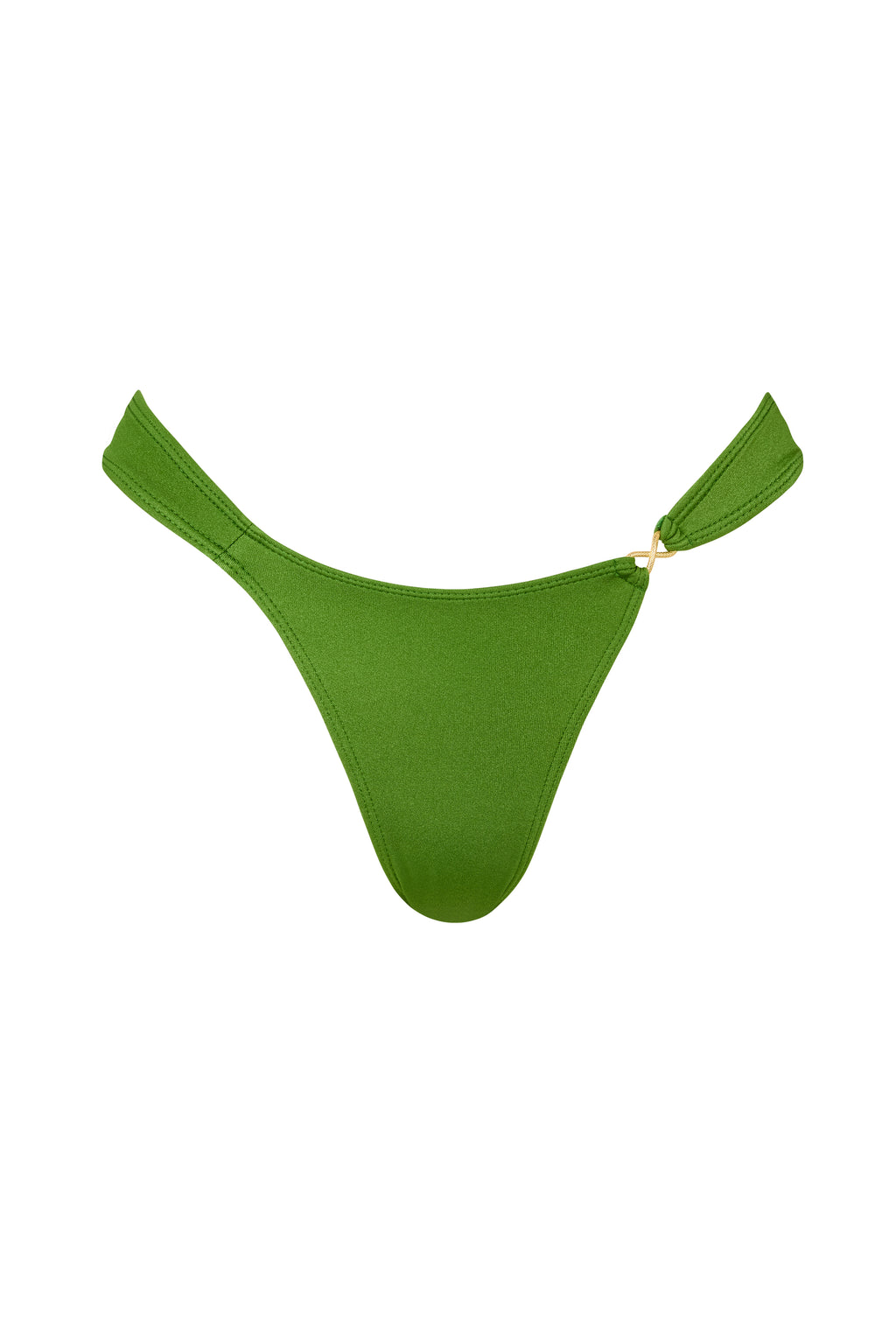 The Nyra in Cactus by Sommer Swim is a cheeky bikini bottom featuring an Infinity gold hardware embellishment and is designed to be worn medium to high waisted.